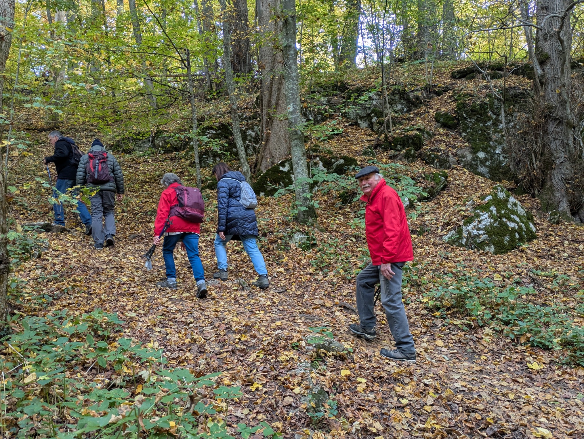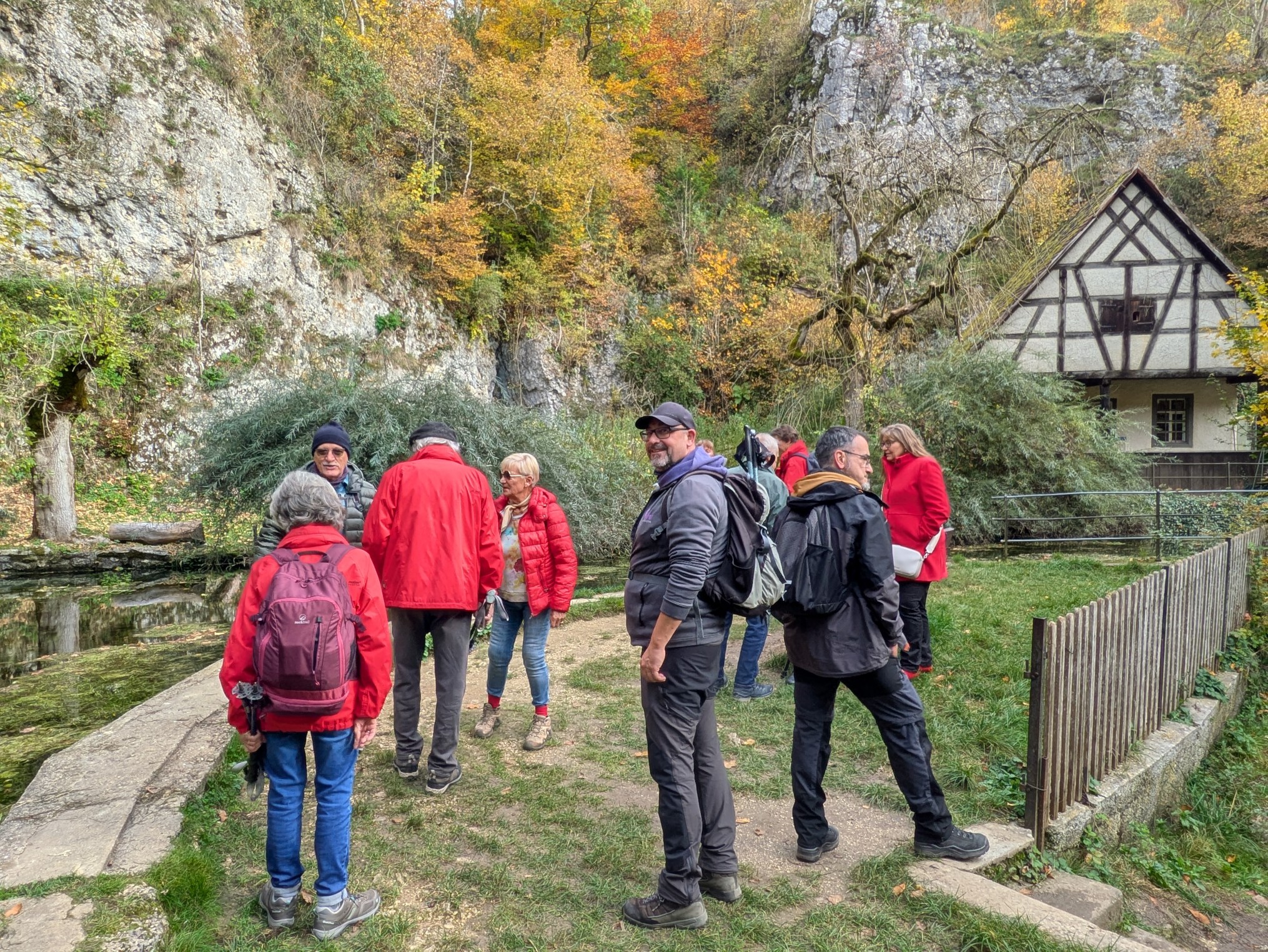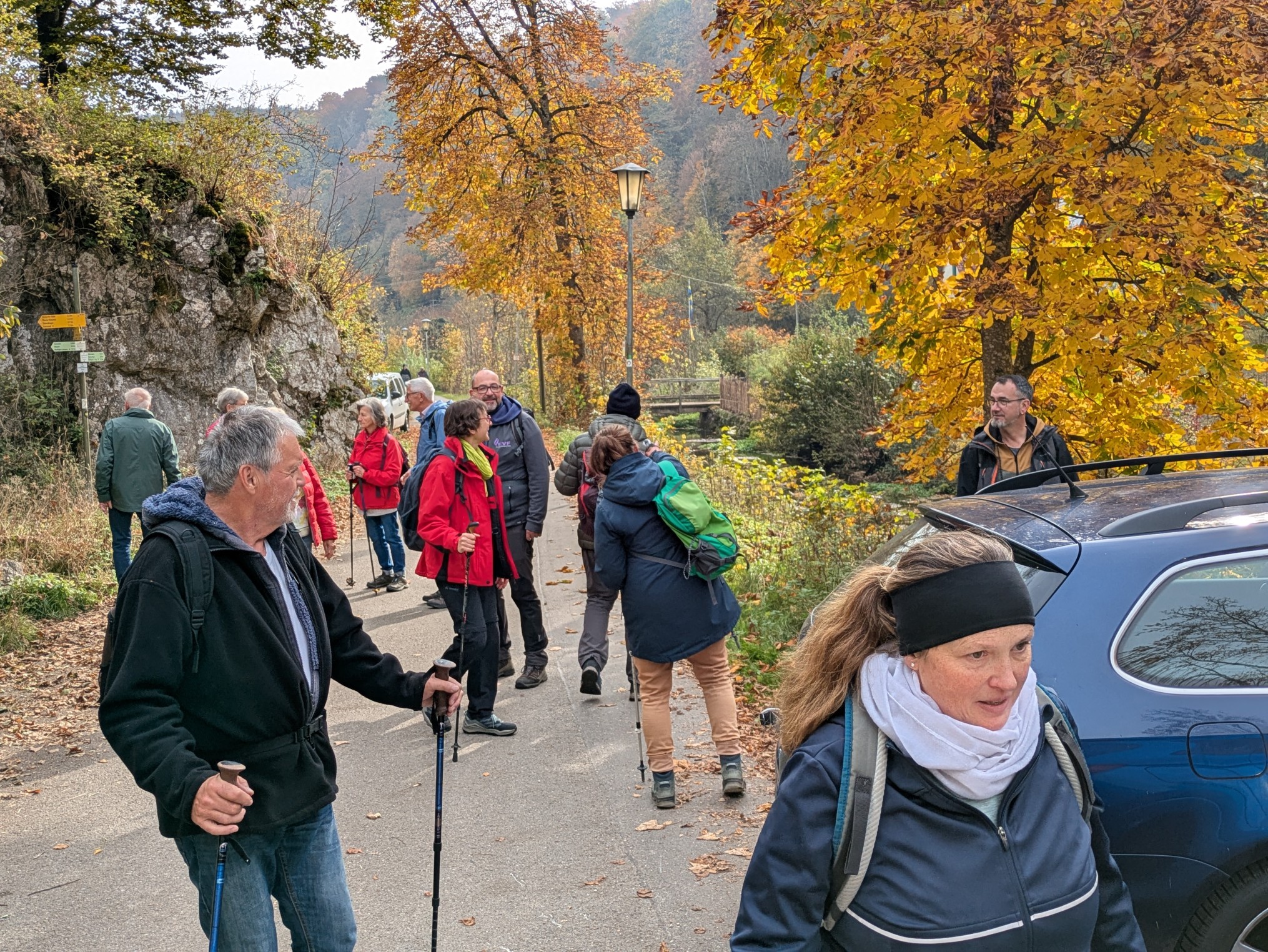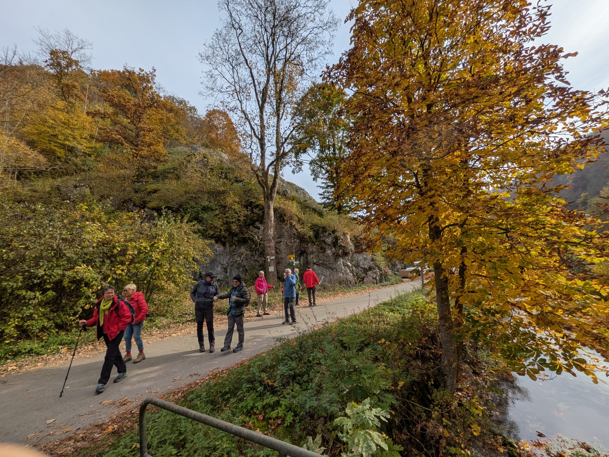 am vergangenen Sonntag bei unserer Herbstwanderung. 15 Teilnehmer erlebten eine tolle 14 Km Wanderung von Herrlingen bei Blaustein über Weidach zur Weidacher Hütte, unserem Mittagsziel.  Auch der Weiterweg über die Hochfläche, vorbei an Dolinen, mächtigen Eichen, goldenen Ahornbäumen und weiten gelb leuchtenden Maisfeldern hatte seinen Reiz. Wildromantisch war der teils knifflige Abstieg durch imposannte Felsformationen. Alle waren doch recht trittsicher und durch Geländer gut gesichert erreichten wir unfallfrei das Naturschutzgebiet Kleines Lautertal.