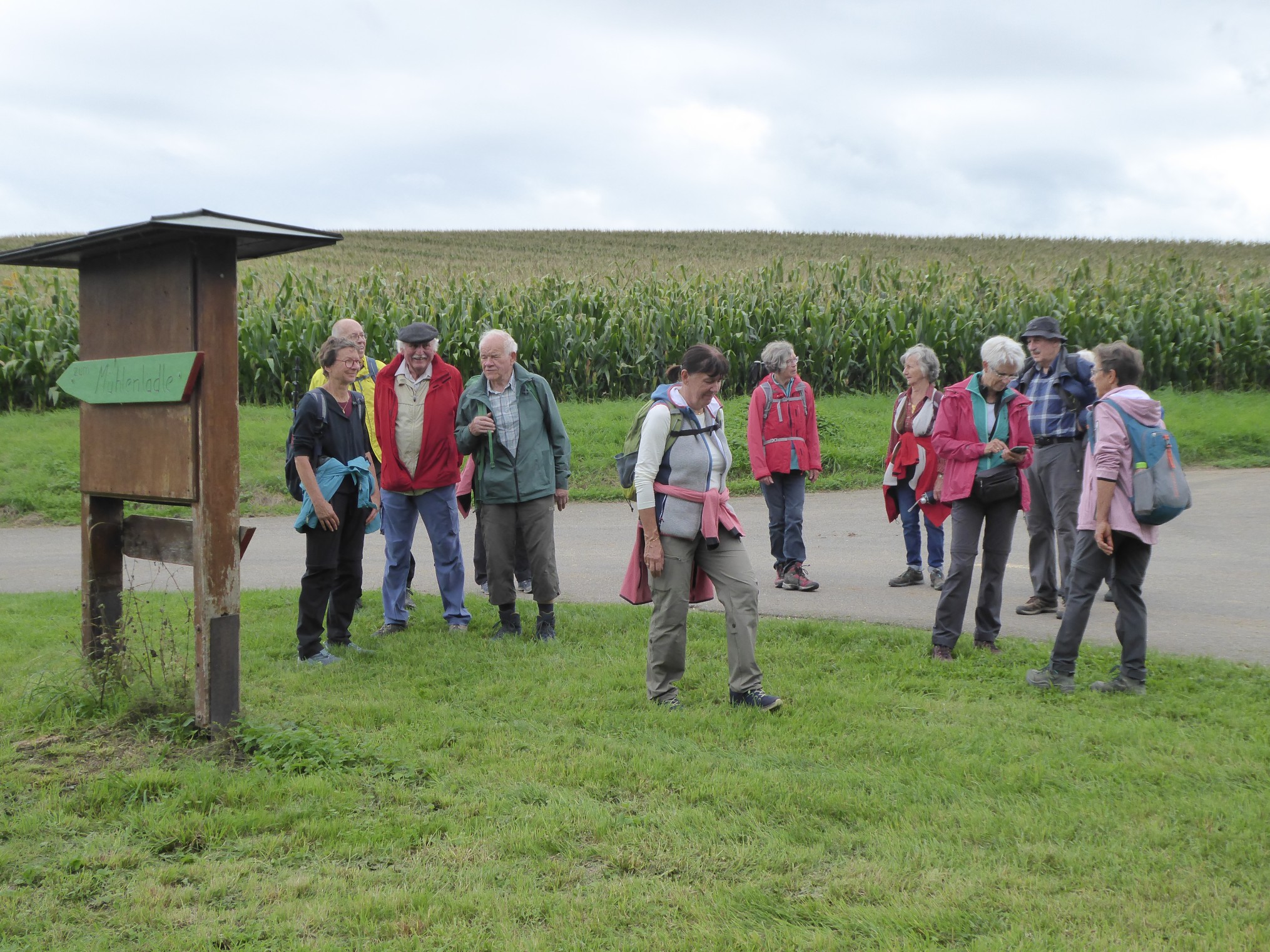 Eine abwechslungsreiche Tour, von Alfred mit viel Witz und Wissen gewürzt: So erfuhr man von Willy Bürkle dem Erbauer von „Gutenhalde“, einem genialen Tausensassa und Geschäftsmann der Vor- und Nachkriegsjahre. Erfolgreich u.a. mit Speiseölen, Lebensmitteln oder Radios die in Tongehäuse eingebaut wurden, gefertigt in den Keramikwerkstätten von Gutenhalde, heute eine Waldorfschule. Interessant auch die Geschichte des Weinbaus Bolandens 1383 bis 1977 mit einst 15 Hektar Rebfläche. Die Kelter wird seit 1966 vom Albverein Bonlanden als Vereinseim genützt, mit fast 700 Mitgliedern eine der größten Ortsgruppen des Albvereins. Mittagsrast und Höhepunkt der Wanderung mit grandioser Aussicht vom Uhlbergturm, einer Betonkonstruktion aus den 60er Jahren, übrigens bewirtschaftet von einem sehr rührigen Pächter. Der Rückweg ging entlang goldgelber Gerstenfeldern weiter durch Bonlanden und nach einem kühlen Getränk im Hasenheim wieder zur Gutenhalde.